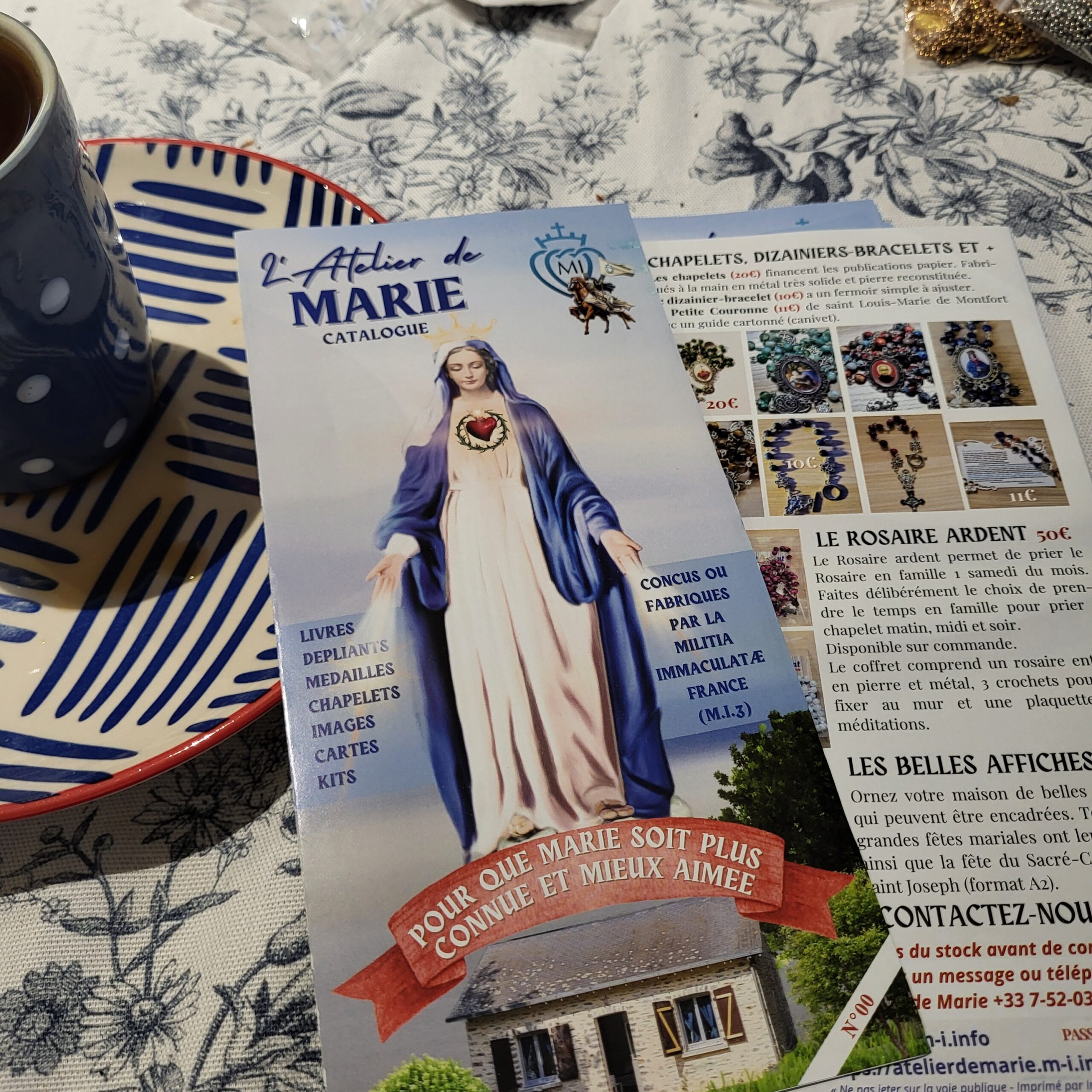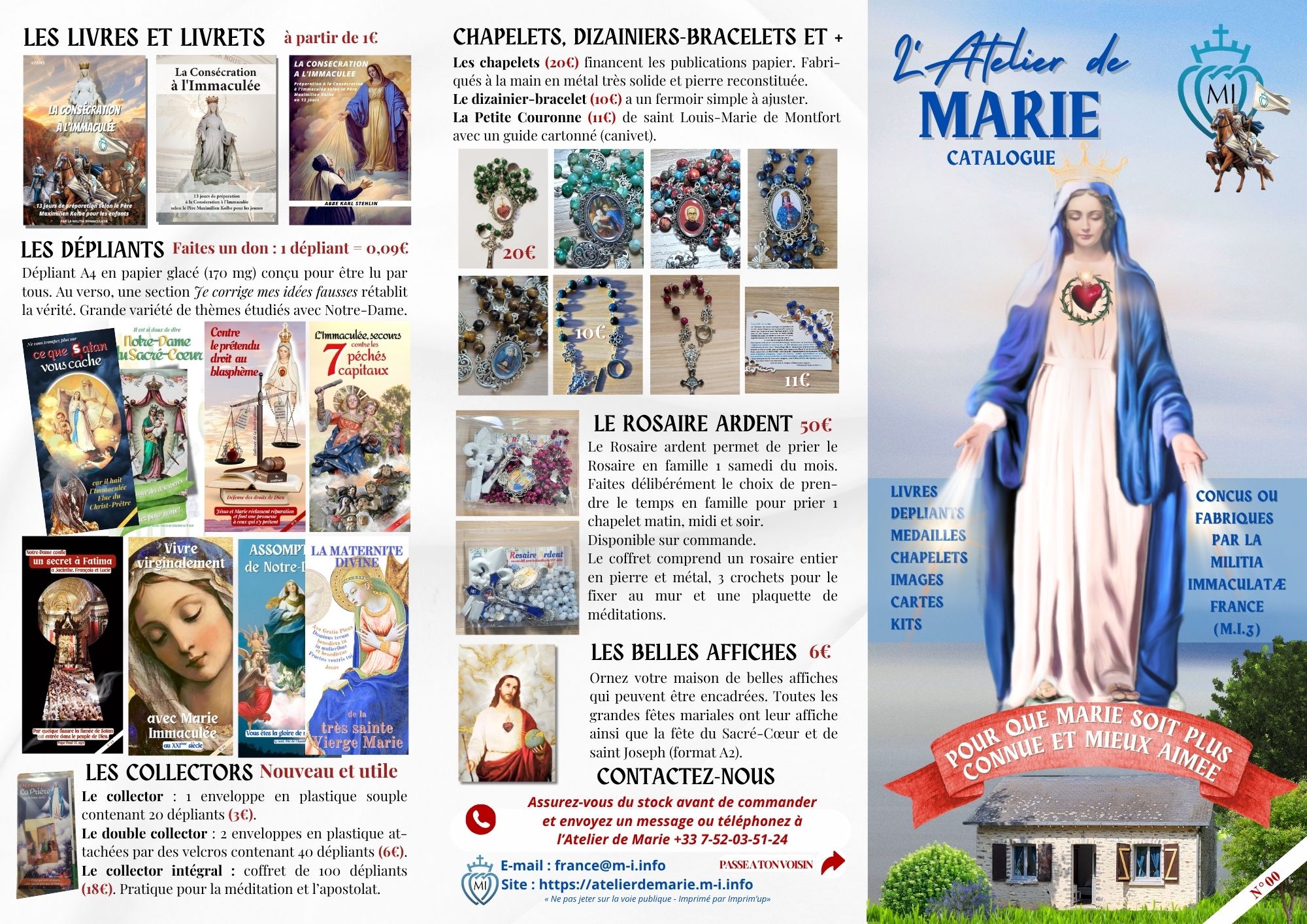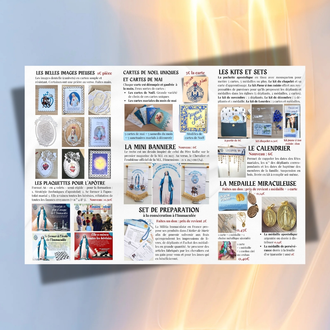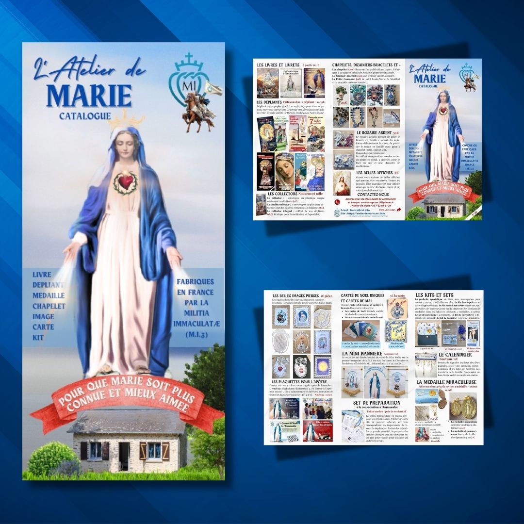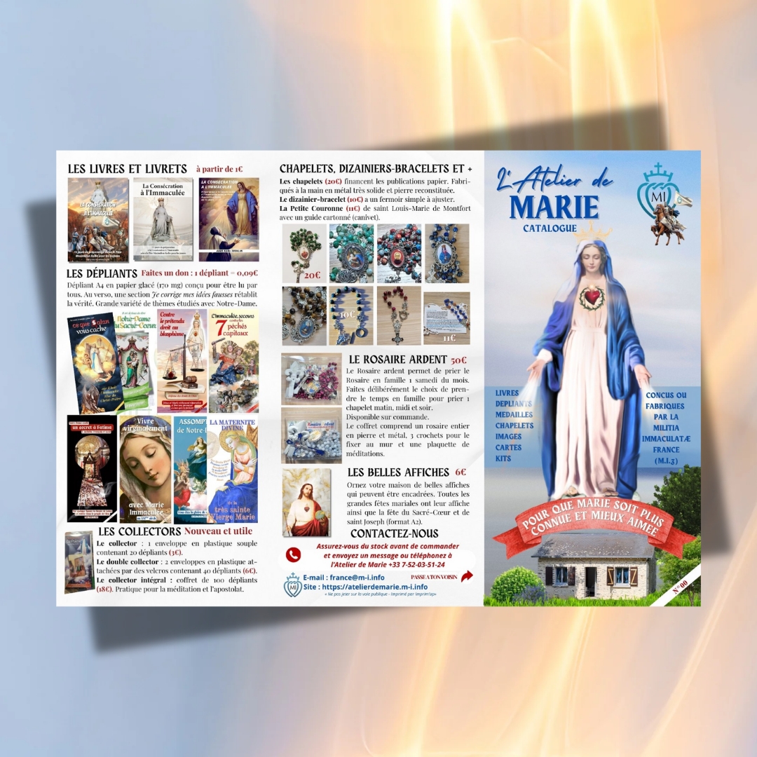 Vous n’utilisez pas internet, vous ne souhaitez pas commander en ligne mais vous voulez découvrir l’Atelier de Marie? Aujourd’hui c’est possible avec le dépliant-catalogue qui vous présente toutes les production mariale et apostolique de la MI France !