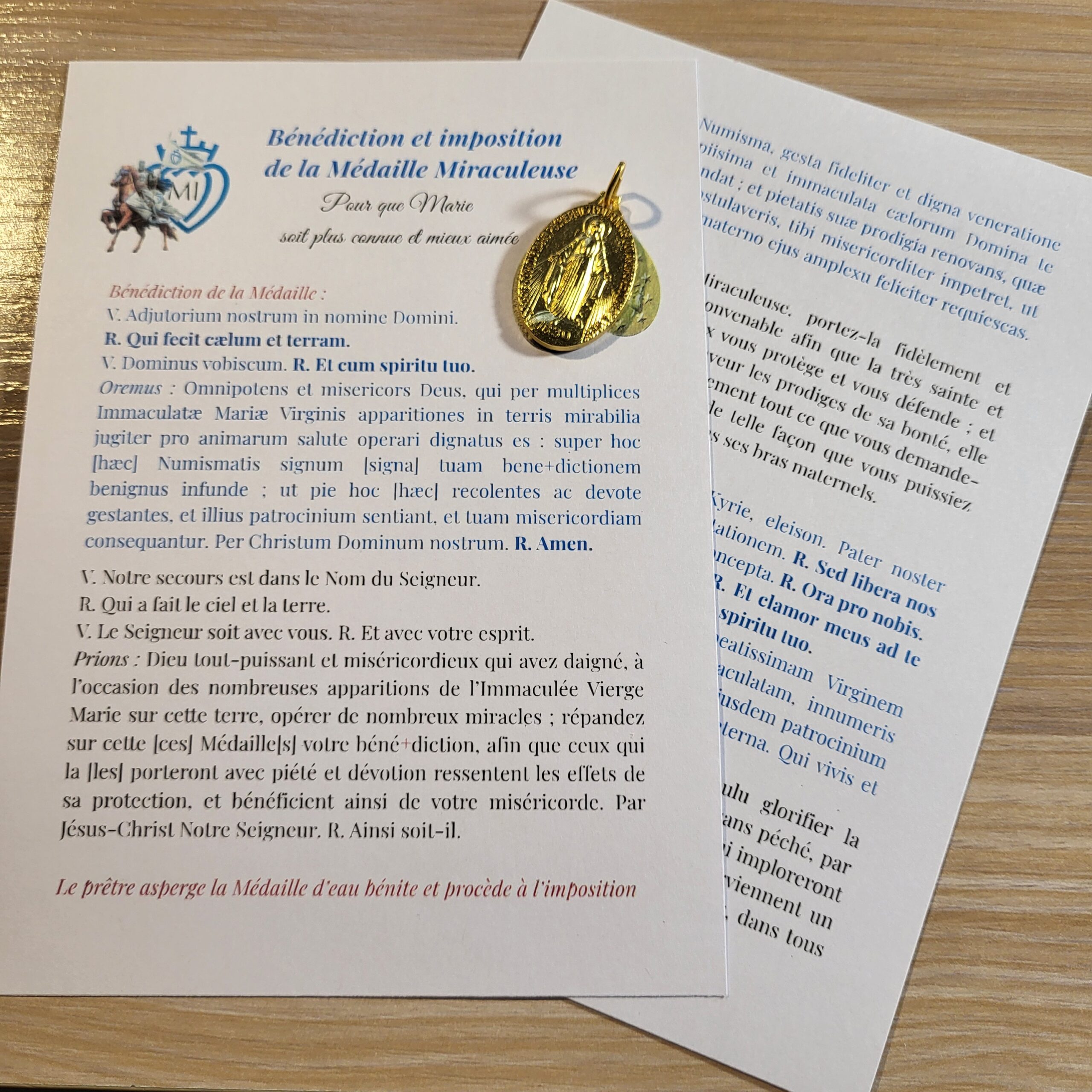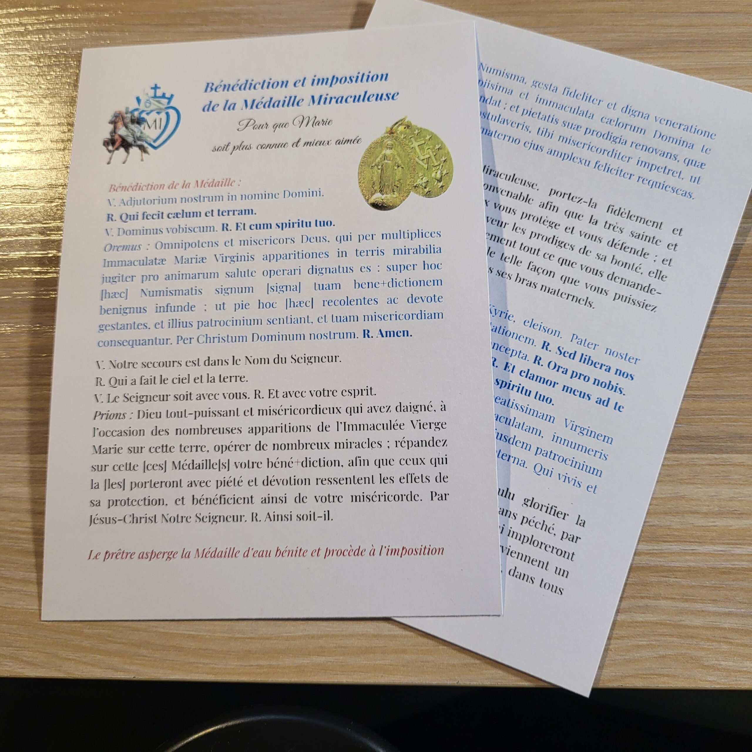 Vous souhaitez faire bénir des médailles (😉psst ! les médailles de l’Atelier de Marie sont déjà bénies !) que vous avez depuis longtemps chez vous ? Vous souhaitez que le prêtre puisse vous imposer la Médaille Miraculeuse pour bénéficier pleinement des grâces attachées par Notre-Dame au port quotidien de la Médaille ? Voici la petite carte du cérémonial en latin-français.