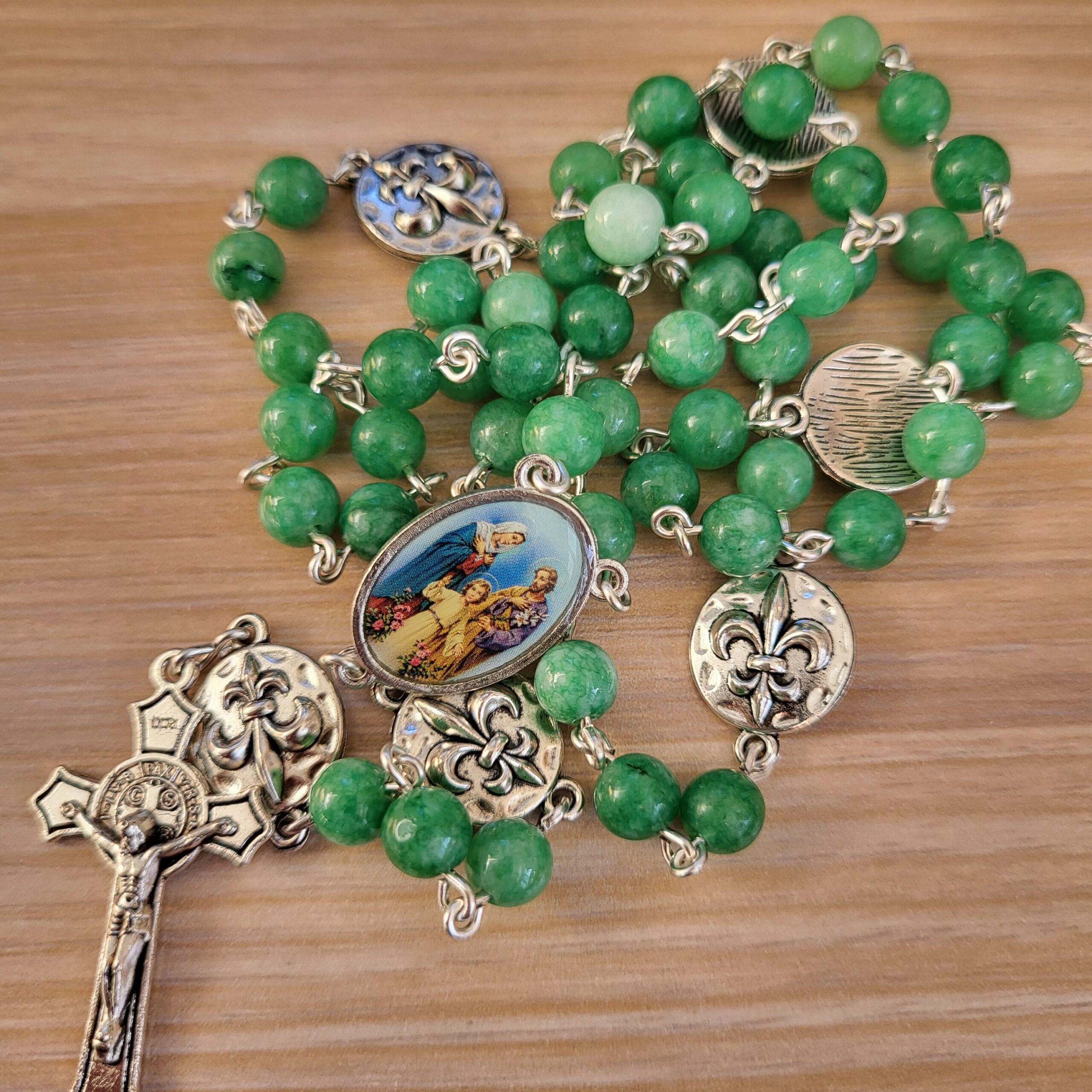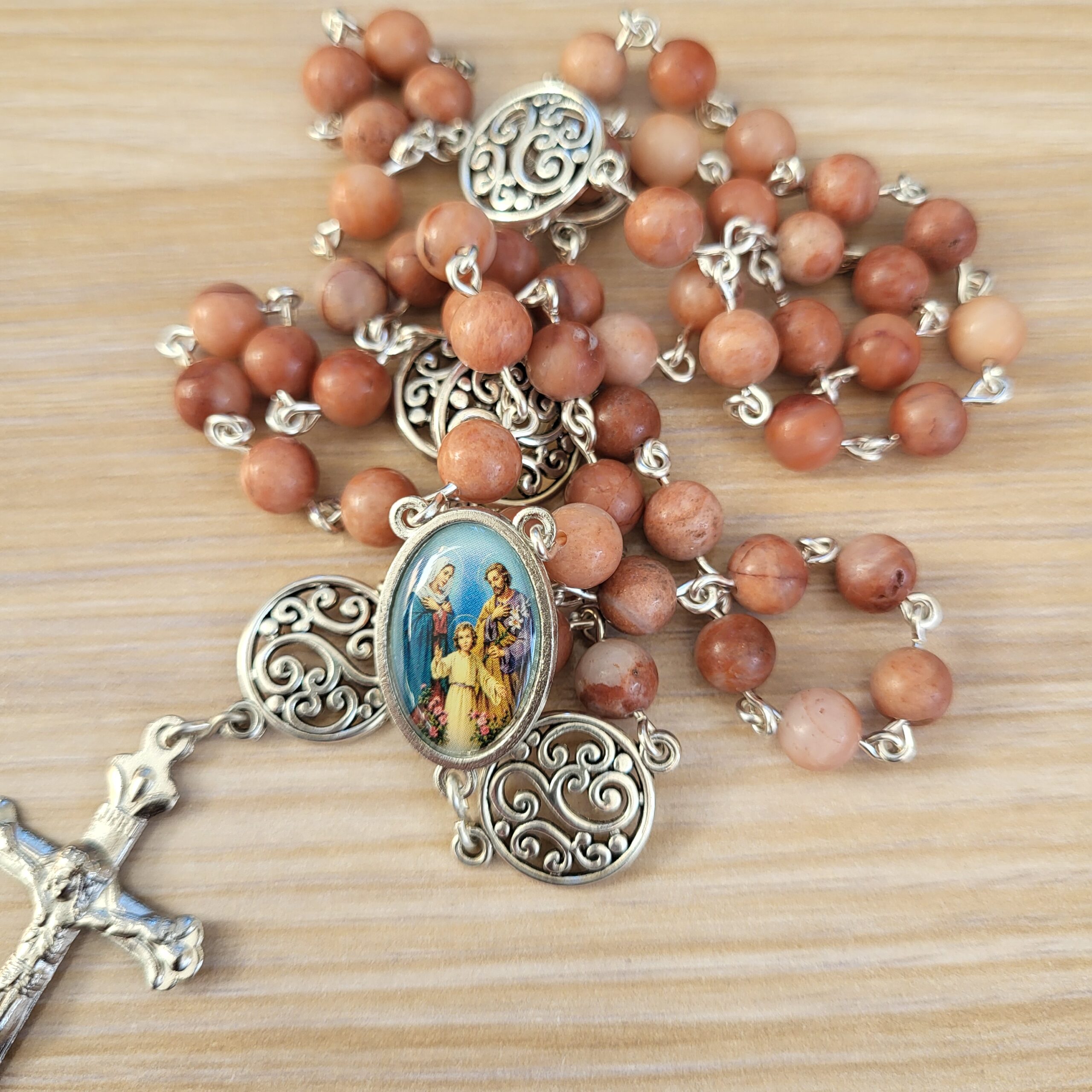 Ce chapelet, fait main, est orné au centre, d’une médaille de la Sainte Famille et d’une belle croix ciselée.