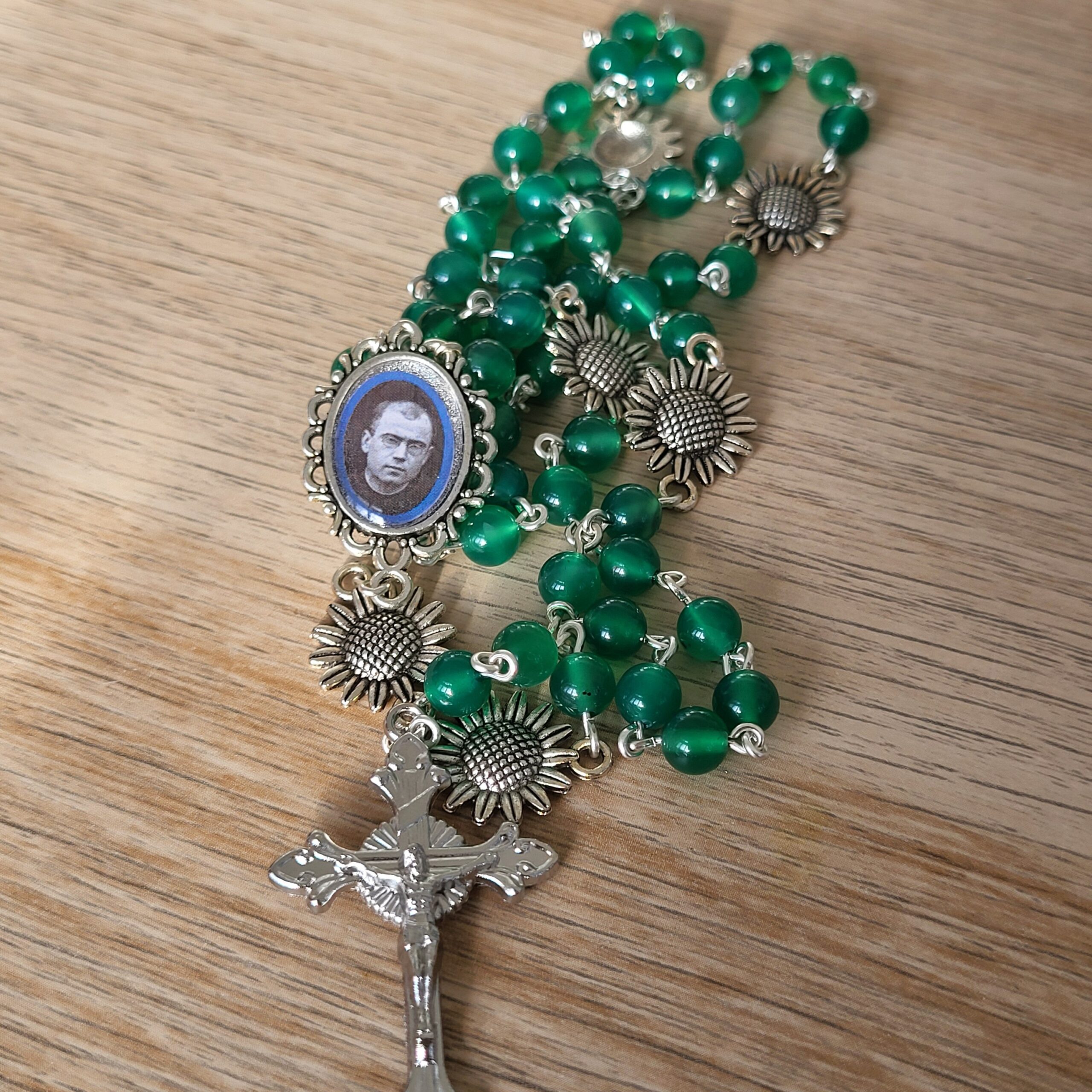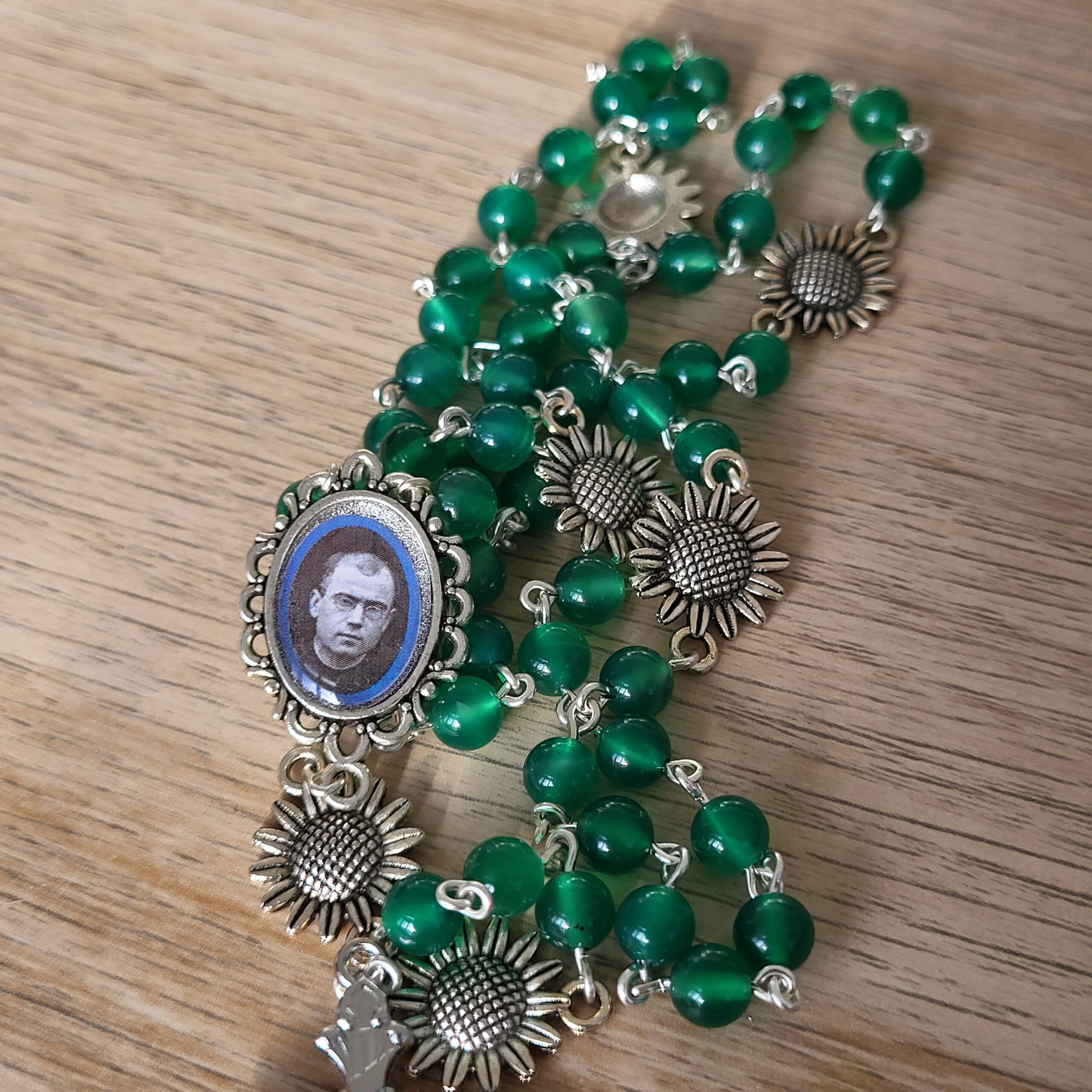Ce chapelet, fait main, est orné au centre, d’une médaille de Saint Maximilien Marie Kolbe faite main et d’une belle croix ciselée ou d’une croix de saint Benoît.