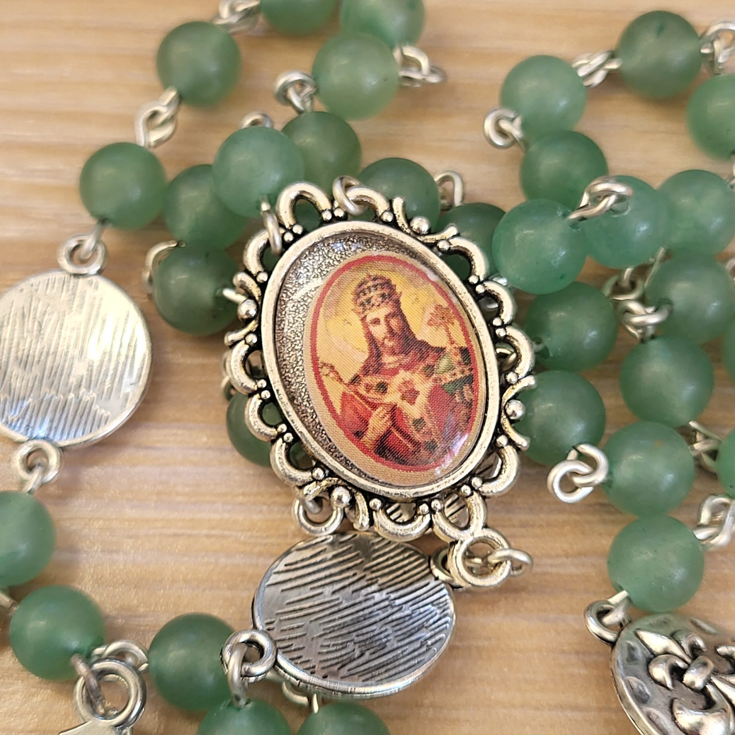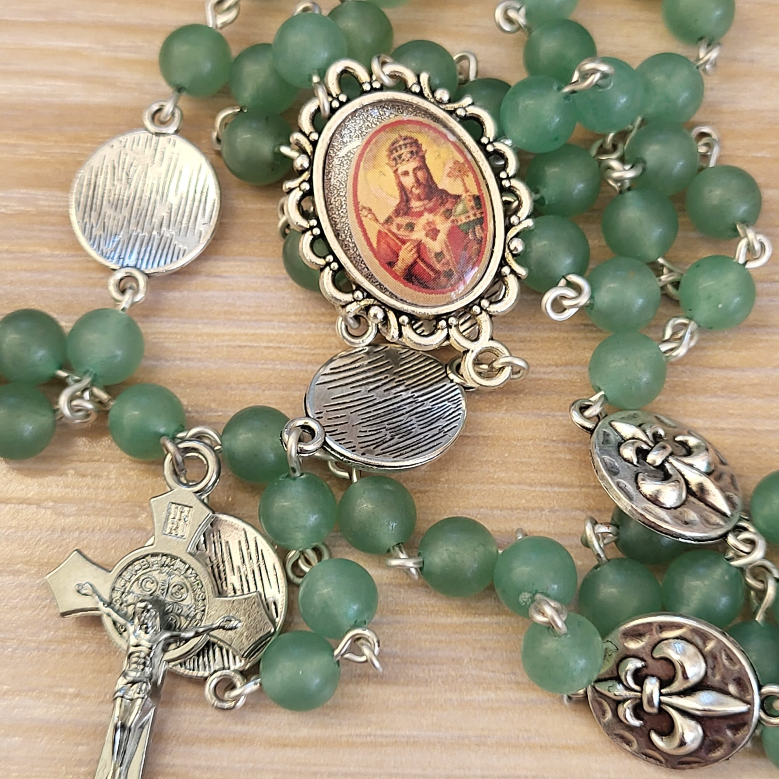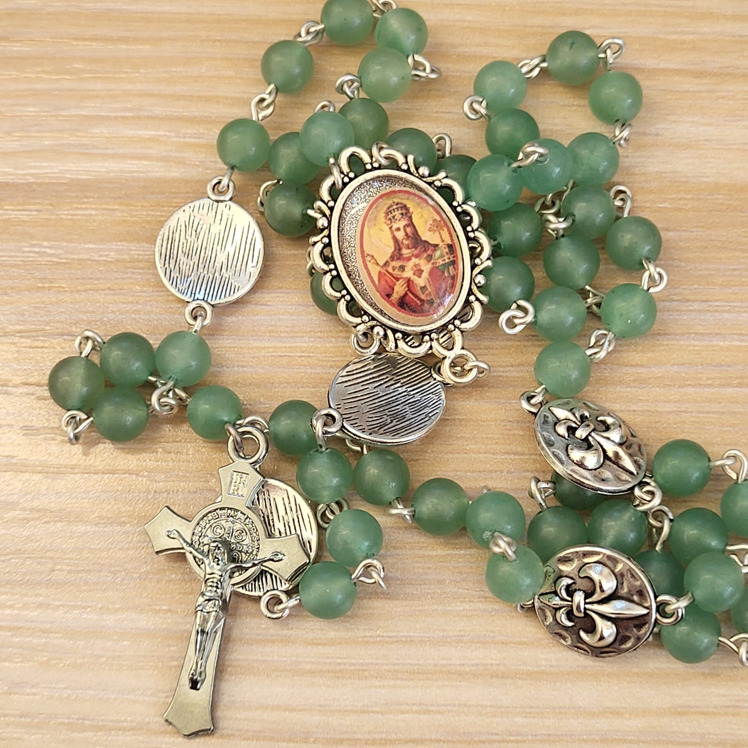 Ce chapelet, fait main, est orné au centre, d’une médaille du Christ-Roi faite main et d’une belle croix ciselée.