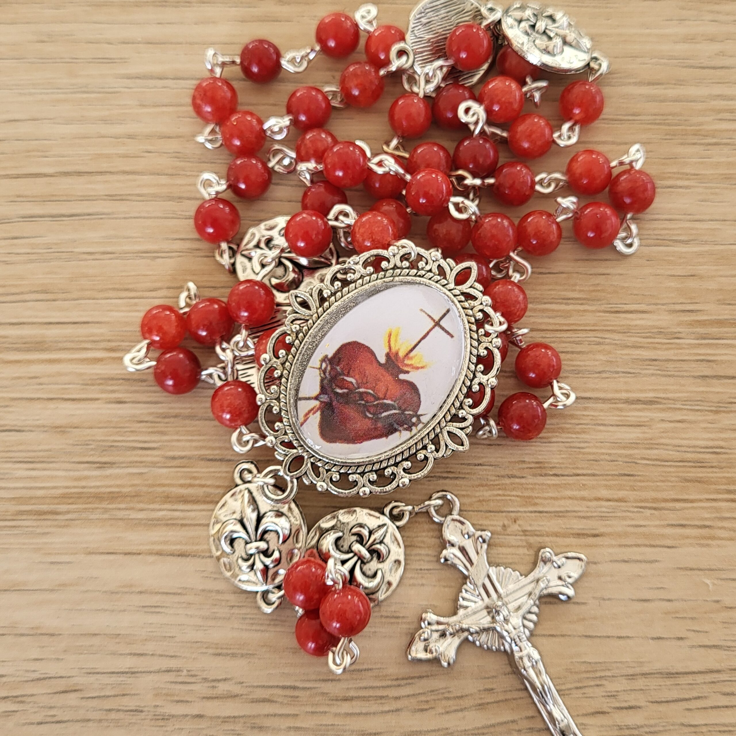 Ce chapelet, fait main, est orné au centre, d’une médaille du Sacré-Cœur faite main et d’une belle croix ciselée.