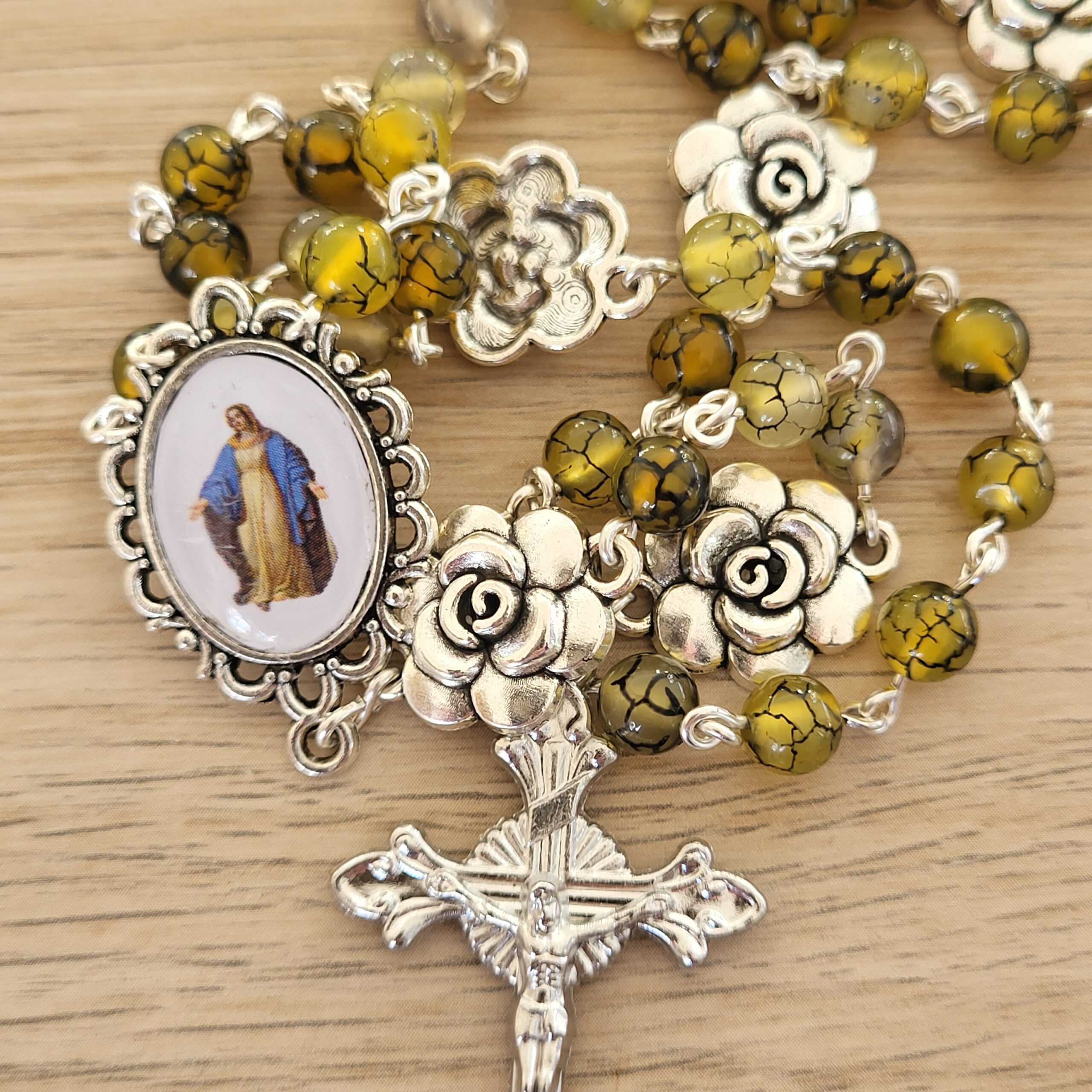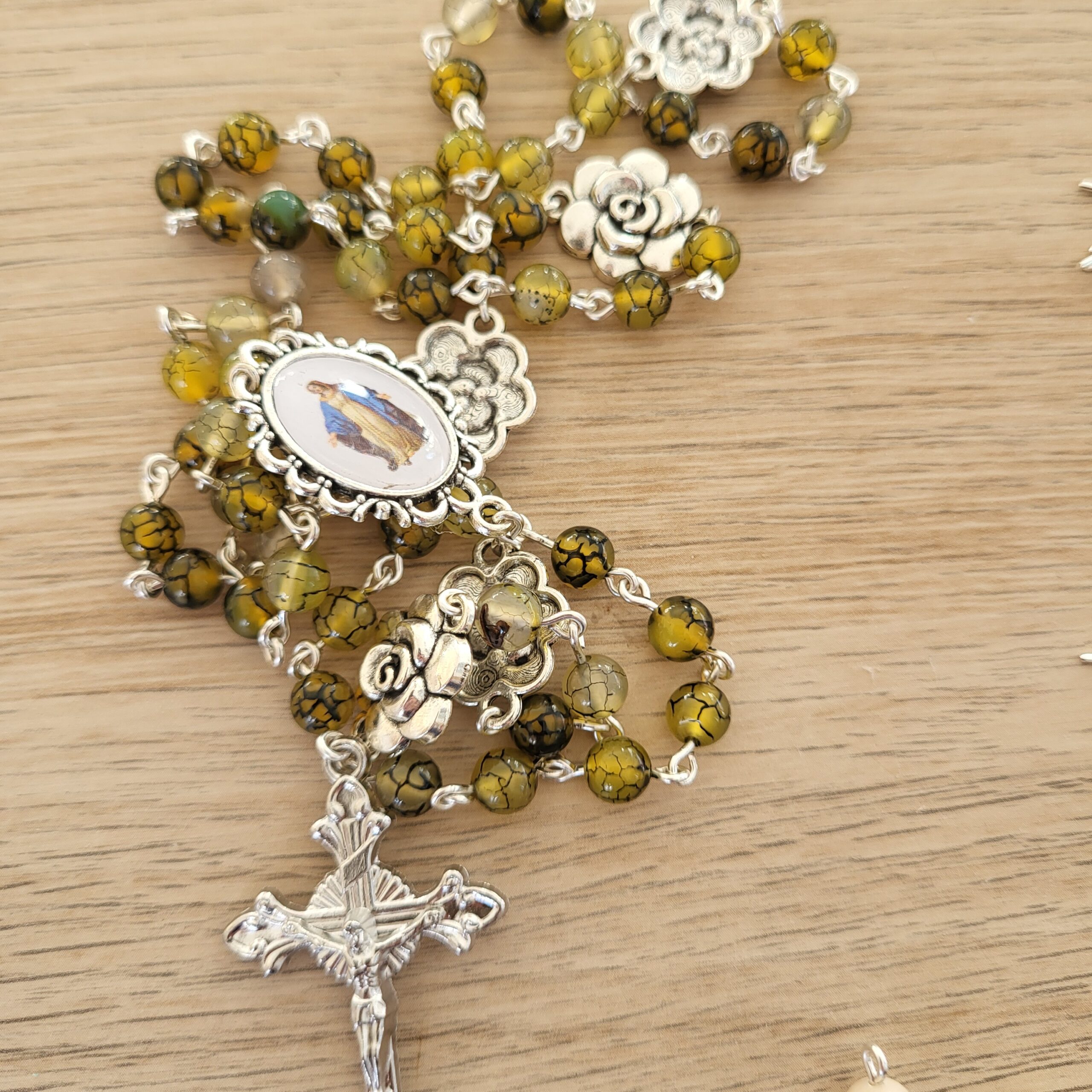 Ce chapelet, fait main, est orné au centre, d’une médaille de Notre-Dame de la Médaille Miraculeuse faite main et d’une belle croix ciselée.
