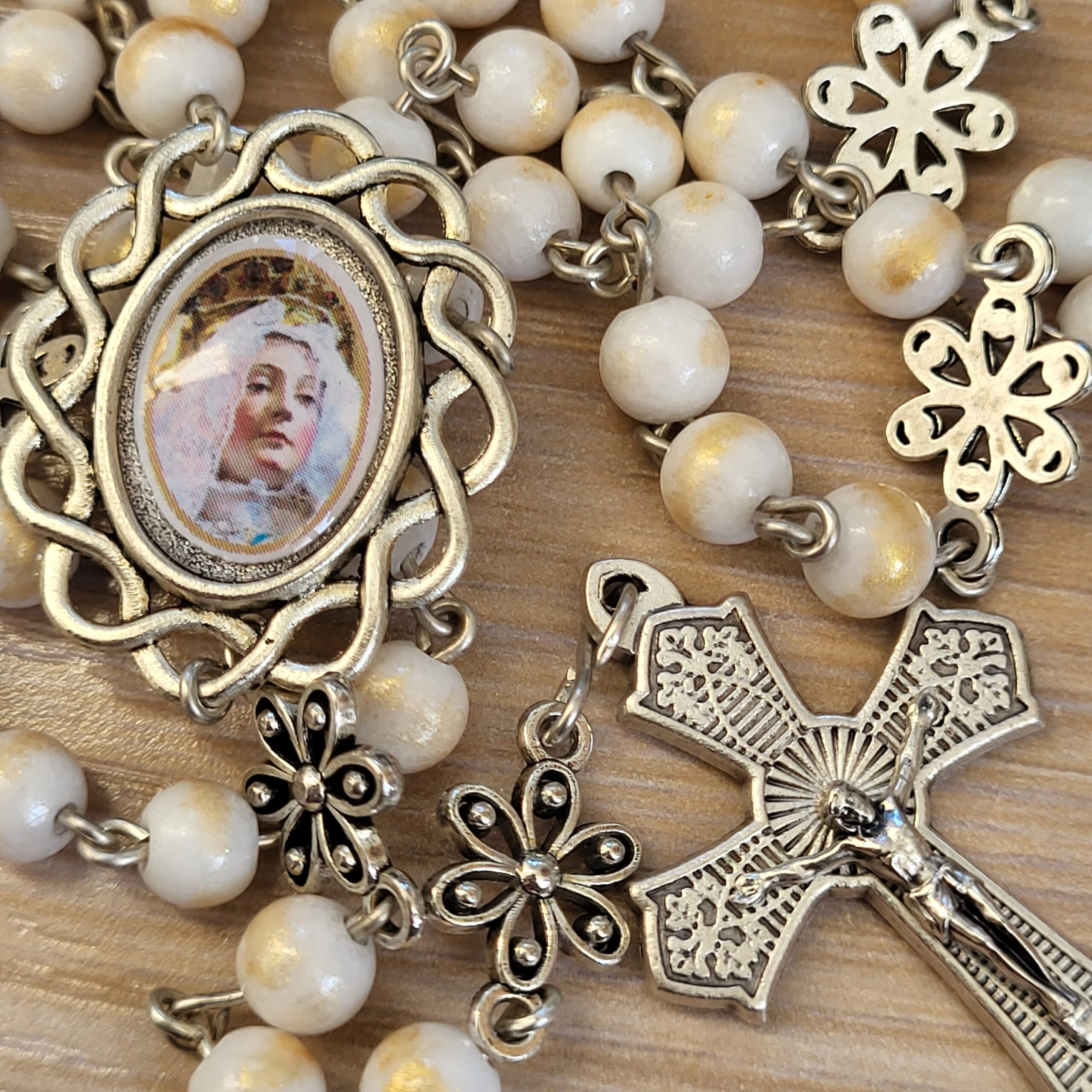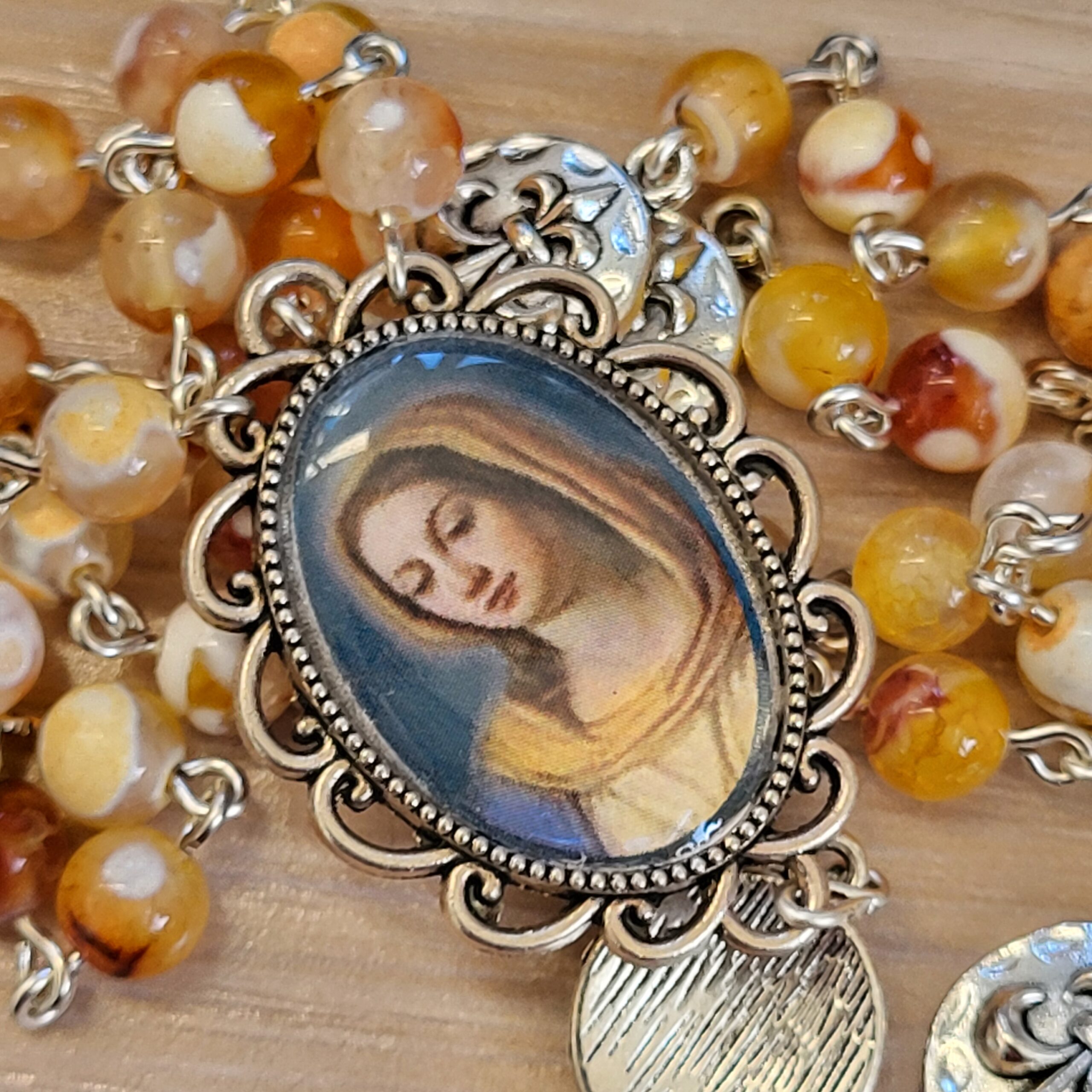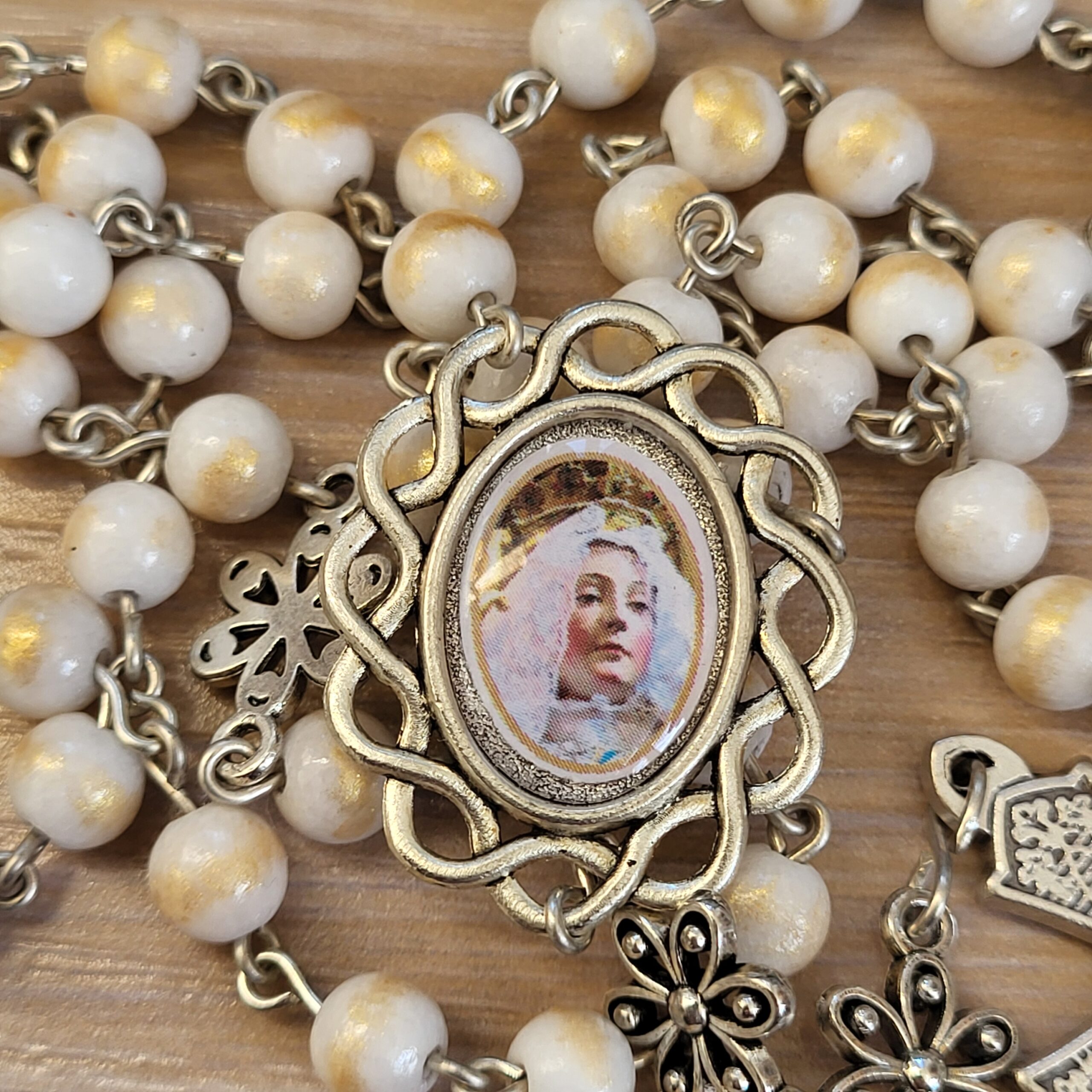 Ce chapelet, fait main, est orné au centre, d’une médaille avec différents portraits de notre Reine, fait main et d’une belle croix ciselée.