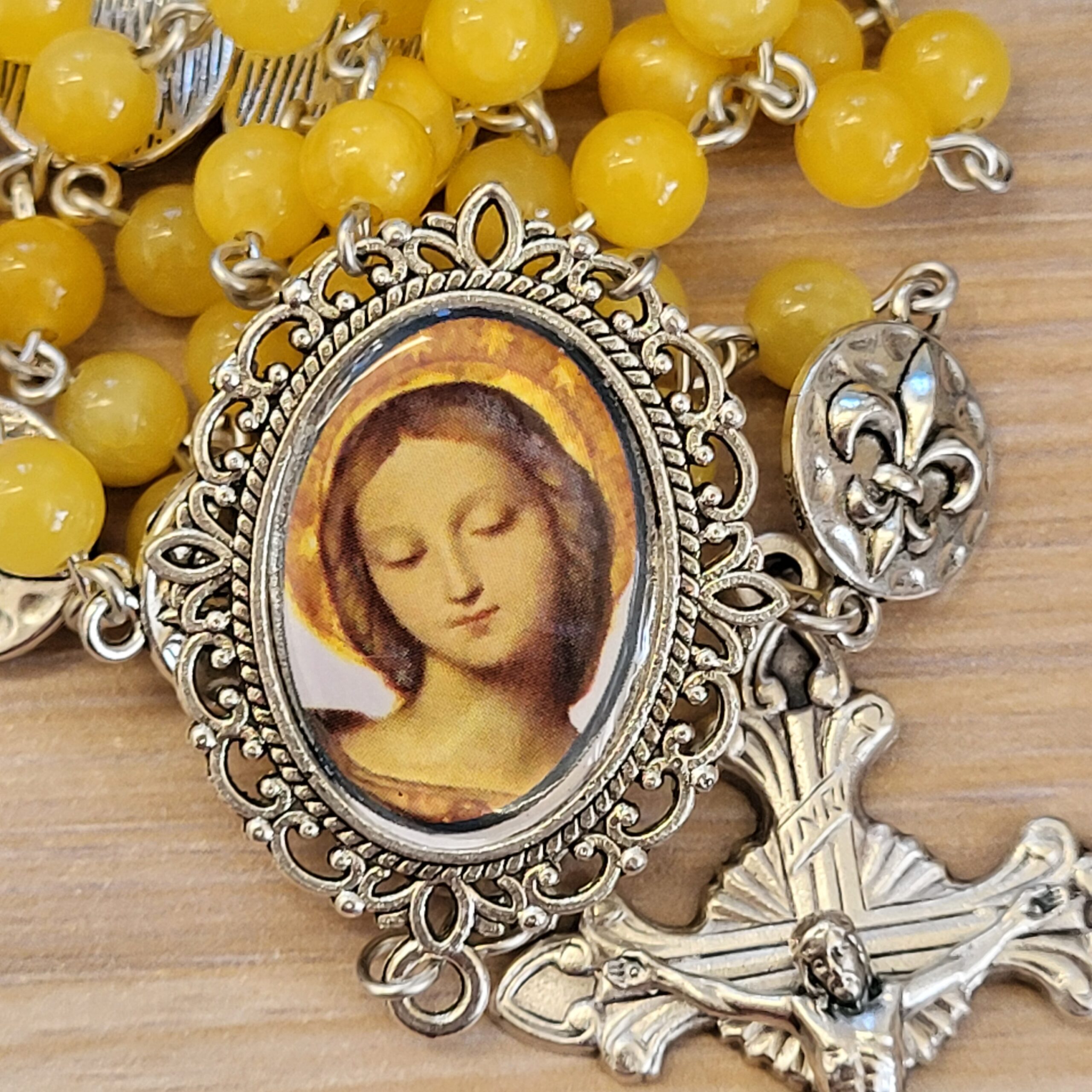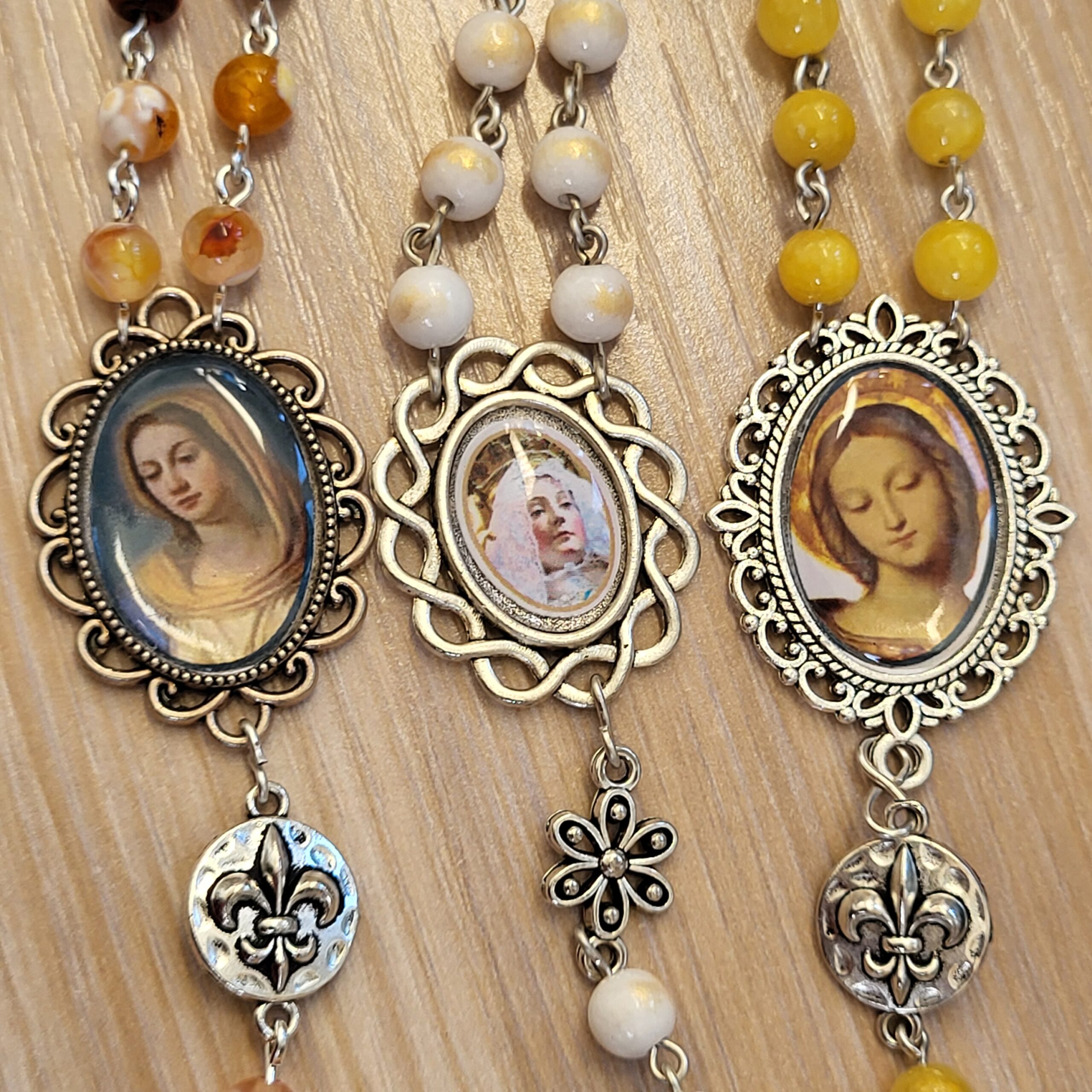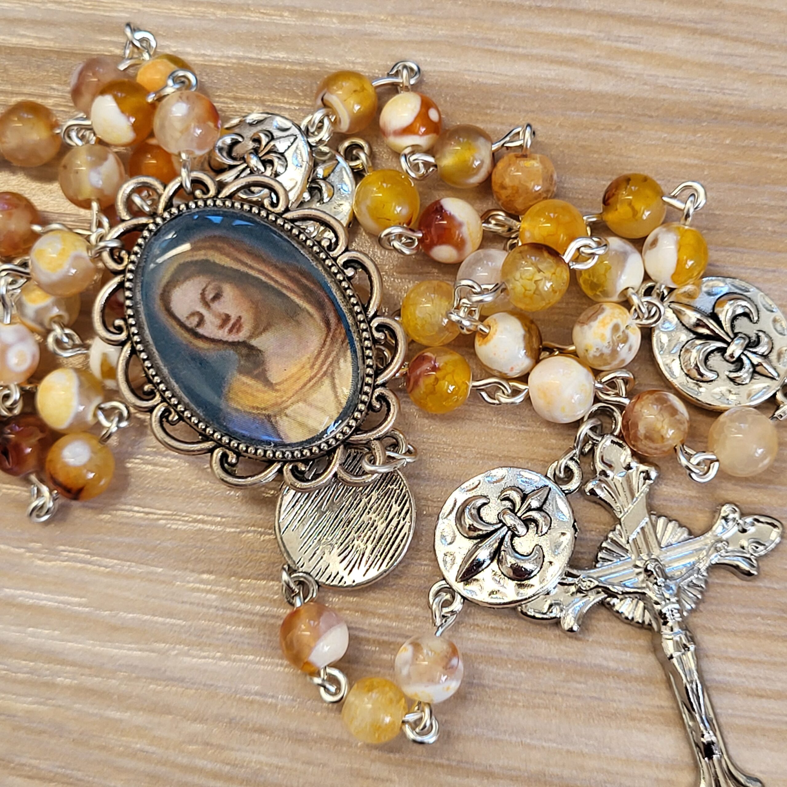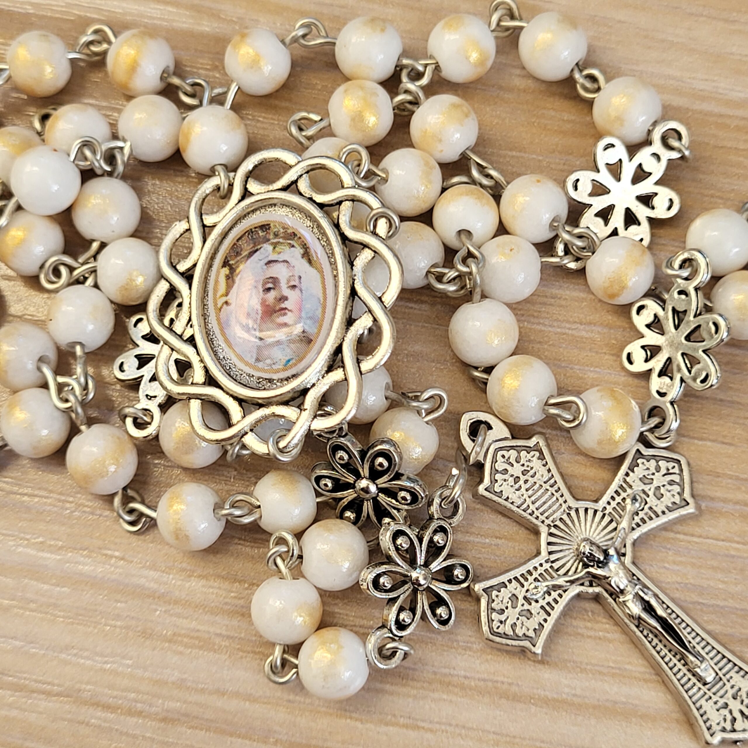 Ce chapelet, fait main, est orné au centre, d’une médaille avec différents portraits de notre Reine, fait main et d’une belle croix ciselée.