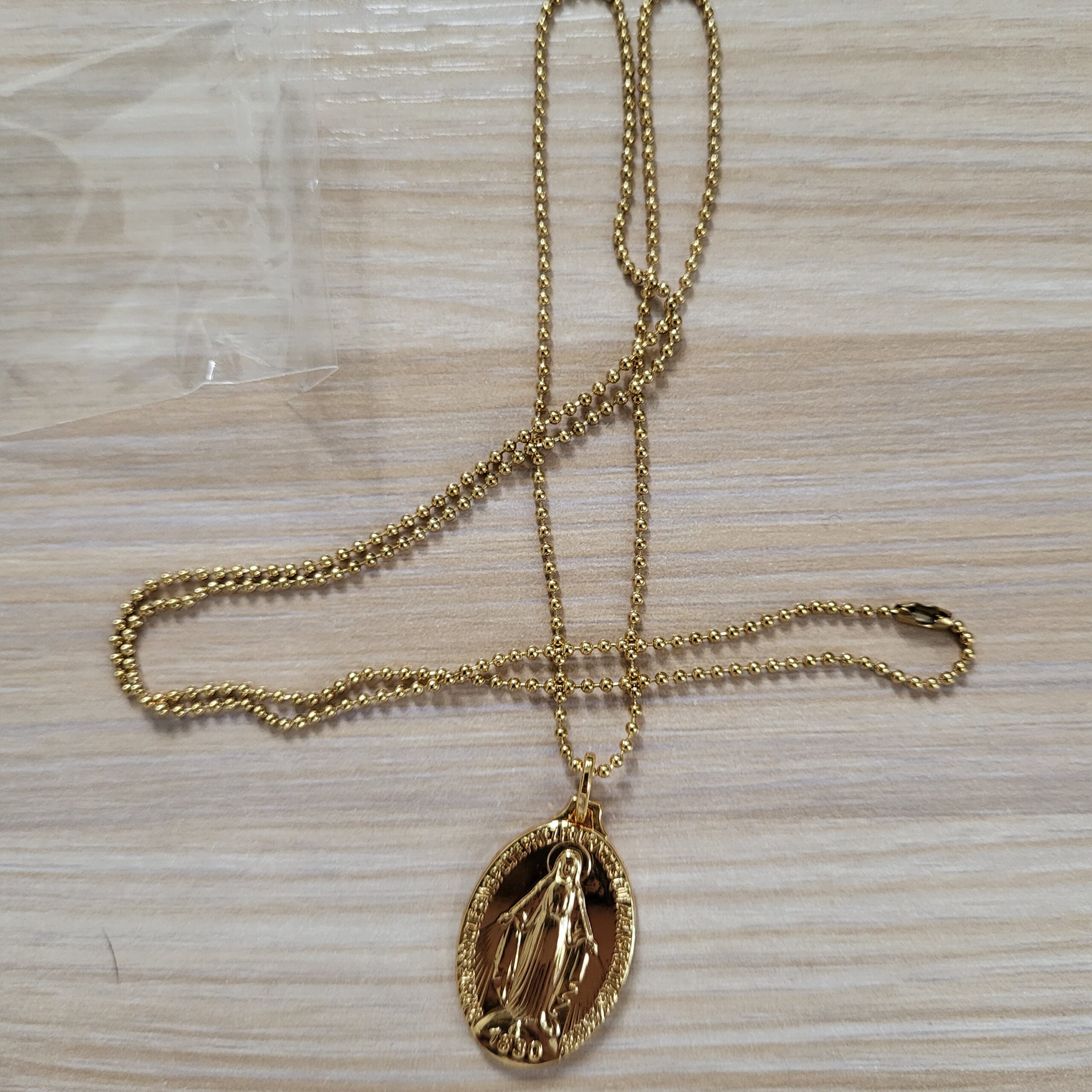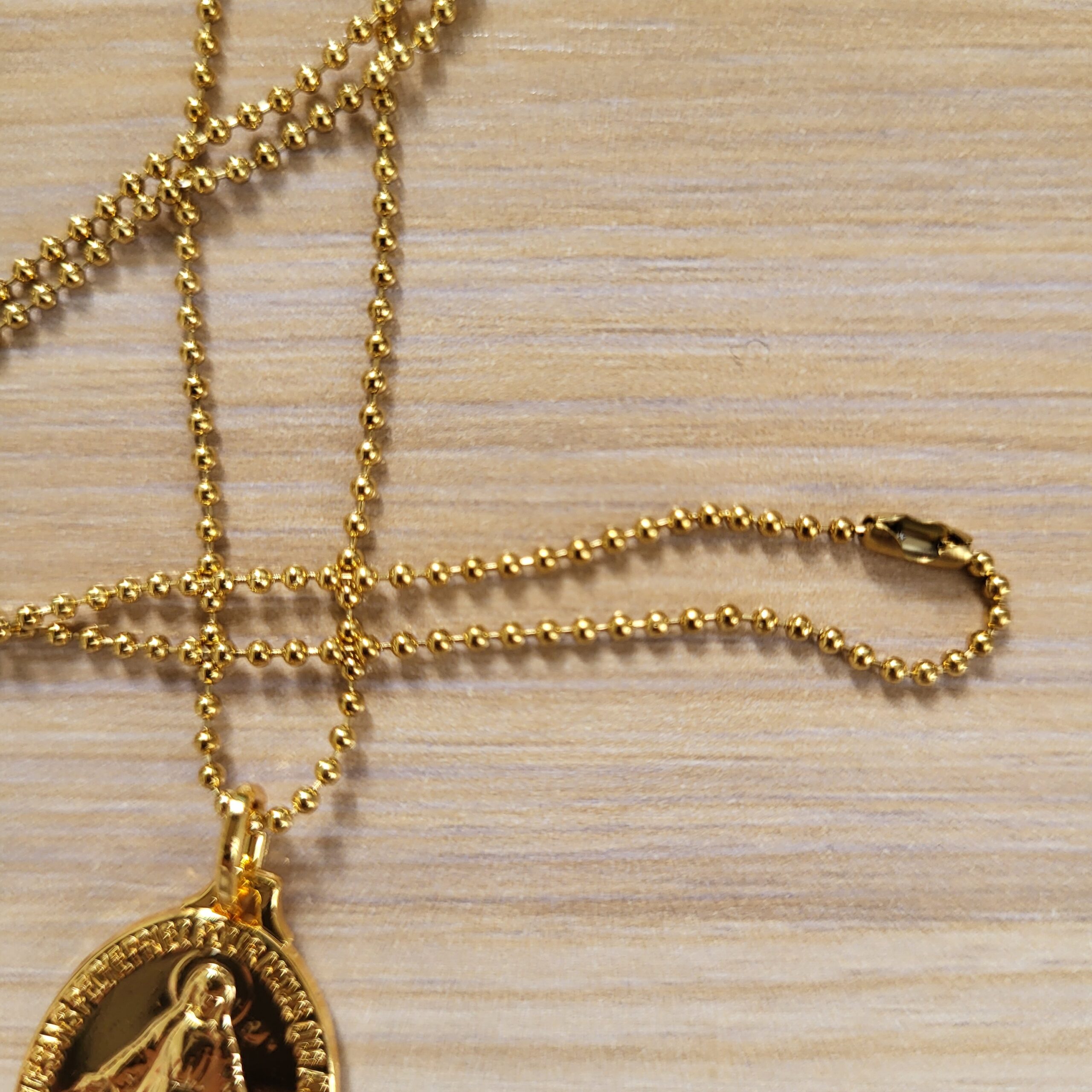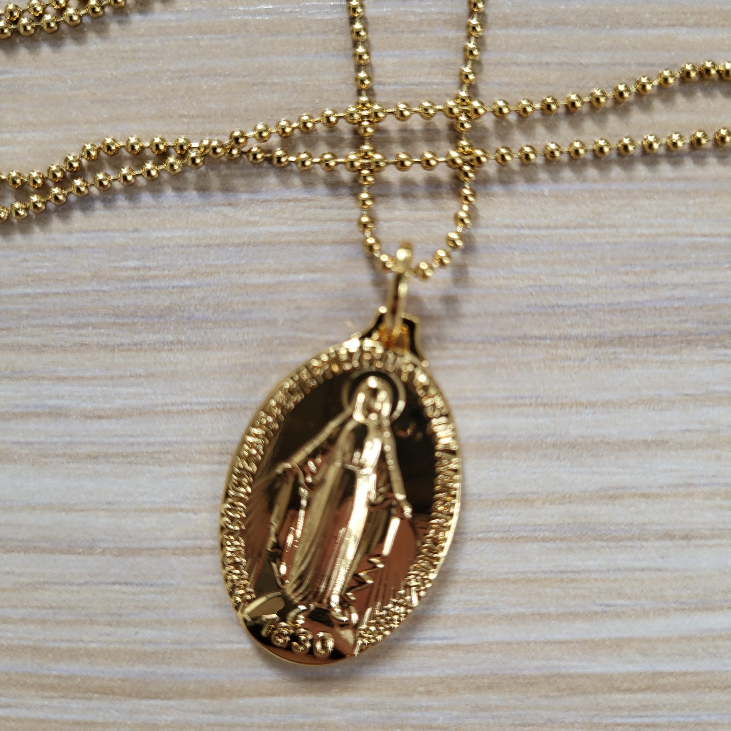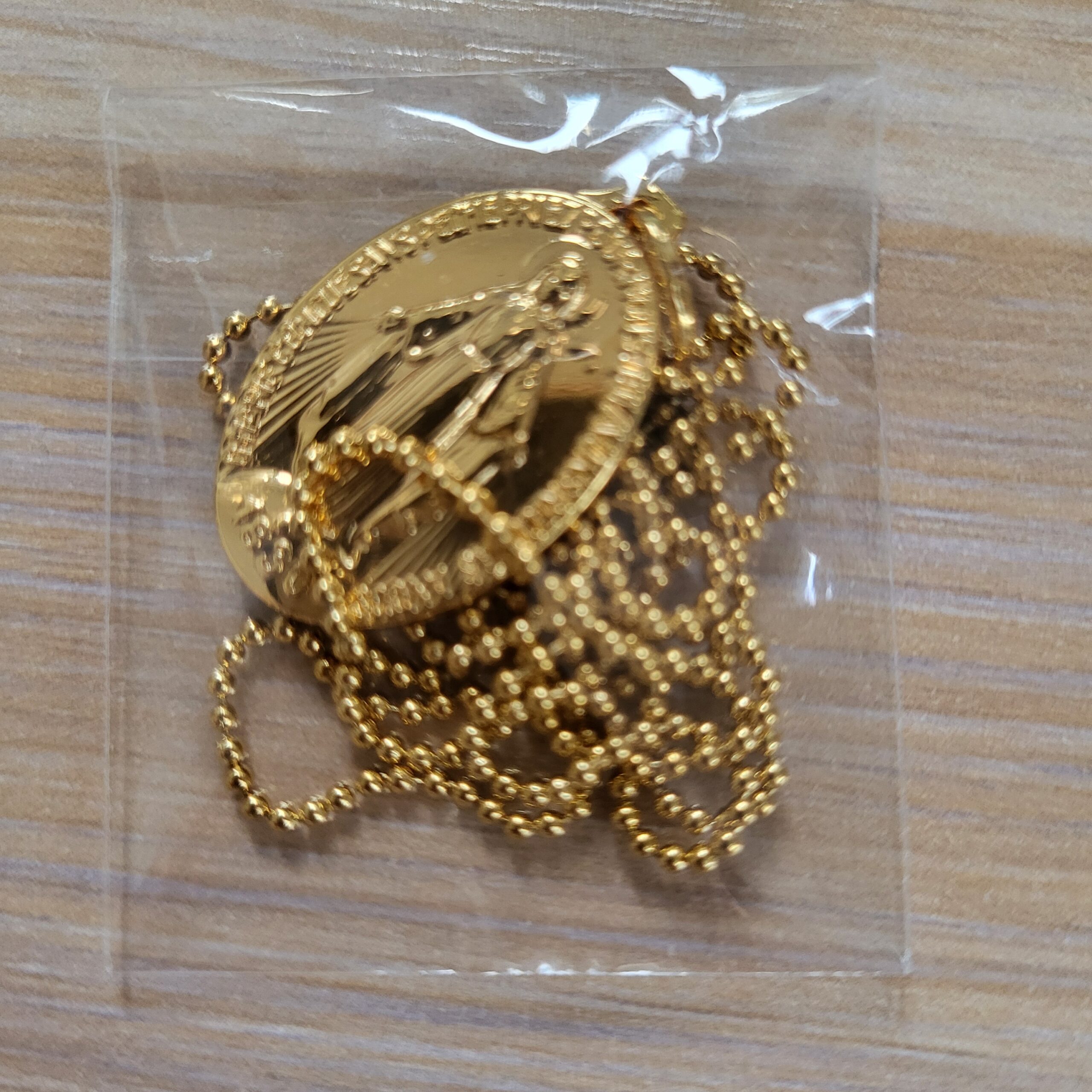 Médaille Miraculeuse de grande taille dorée à la feuille d’or véritable et une chaîne en plaqué or pour que l’Immaculée puisse agir dans les cœurs de tous ceux qui la reçoivent. N’attendez pas que votre médaille soit illisible et indéchiffrable pour en changer ! Cette médaille dorée à la feuille d’or véritable vous ravira avec sa carte d’identité et sa chaîne !