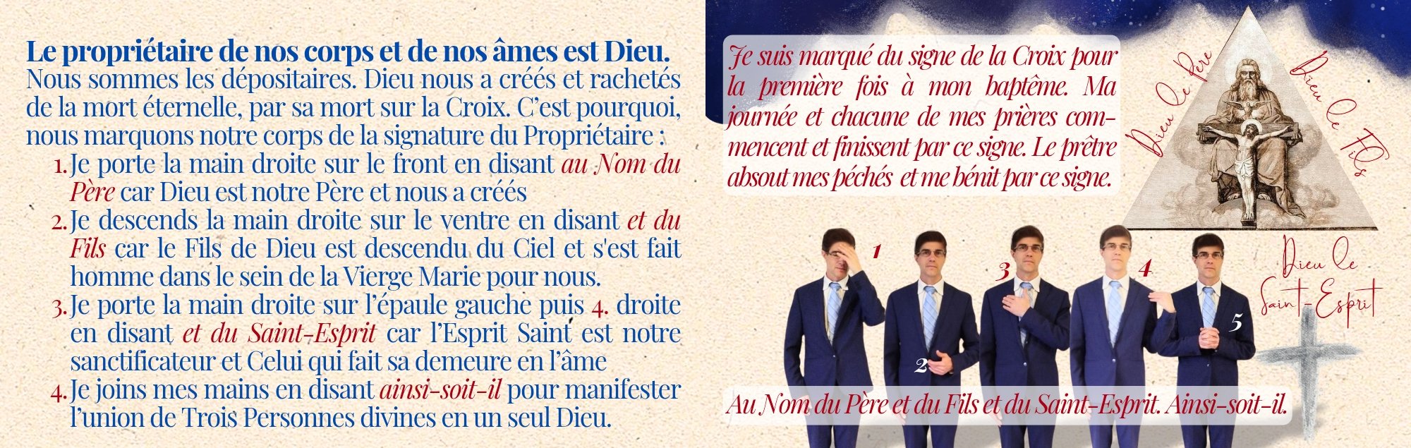 Avec cette petite carte en poche, sur votre table de nuit, dans votre voiture…où que vous puissiez aller, gardez-la près de vous jusqu’à ce que vous ayez pris ou repris l’habitude de faire le signe de la Croix en en comprenant toute la signification et la beauté… Et non comme un chasse-mouche