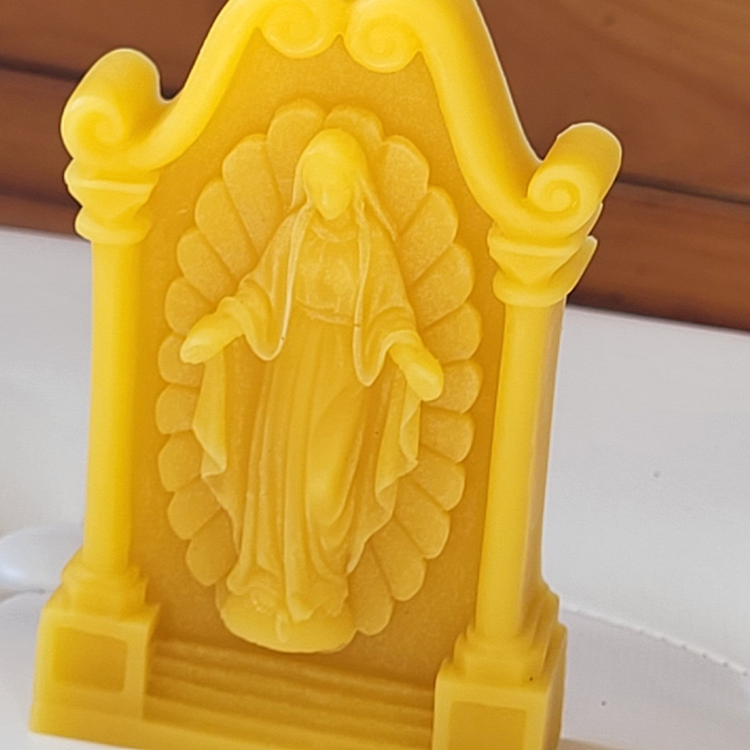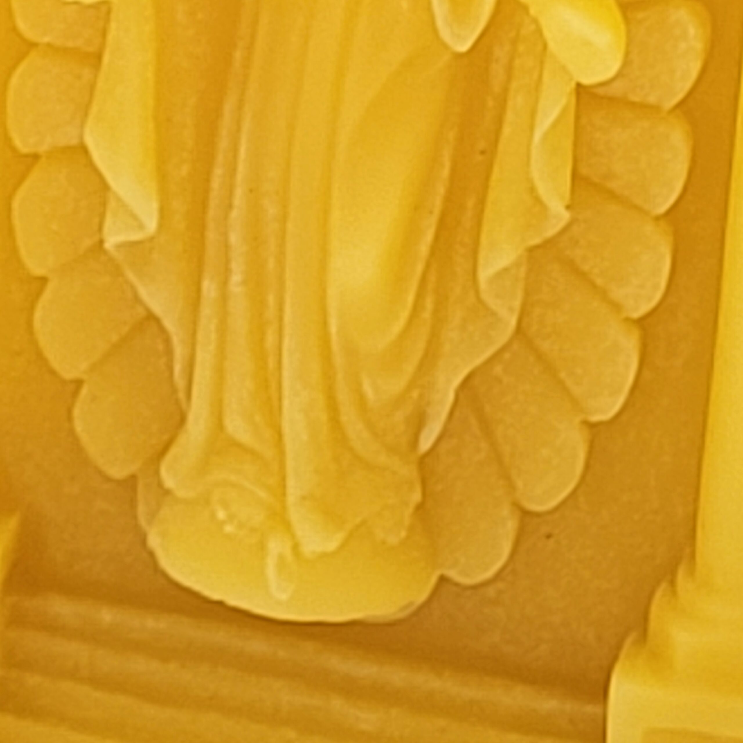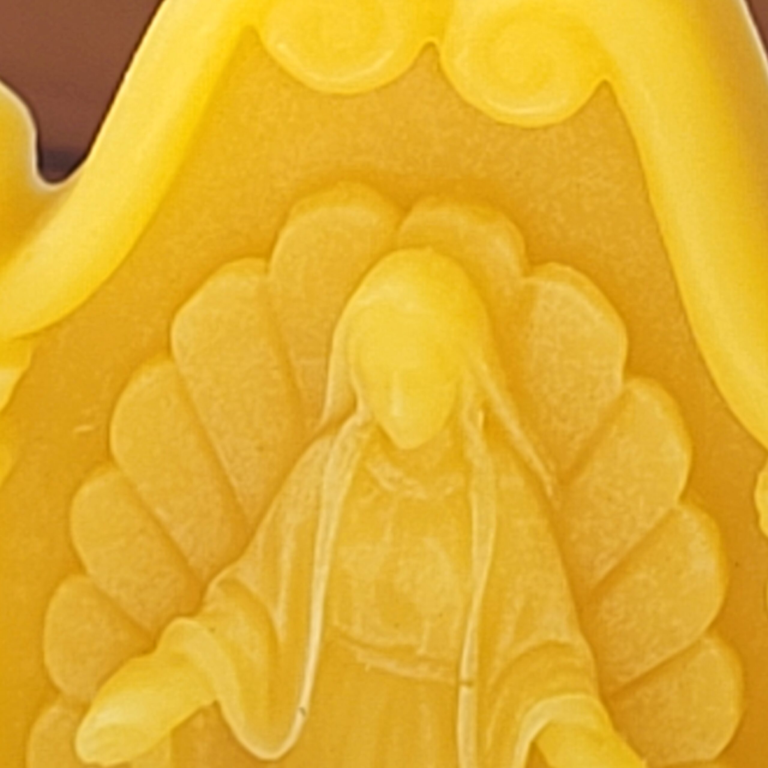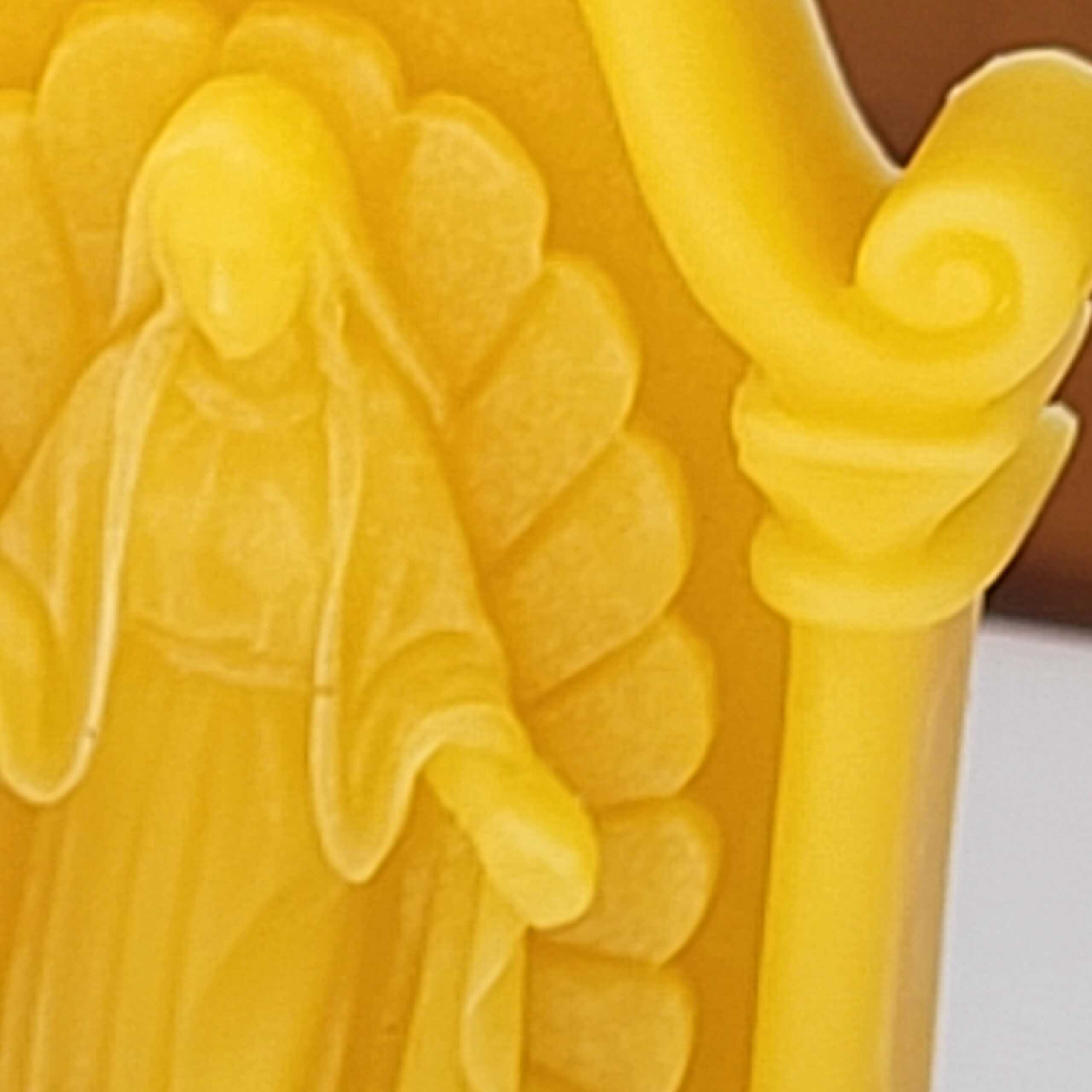 Fabriqué par l’Atelier de Marie, ce bas-relief de Marie Médiatrice de toute grâce en pure cire d’abeille ornera vos coins prière de manière élégante et joyeuse.
